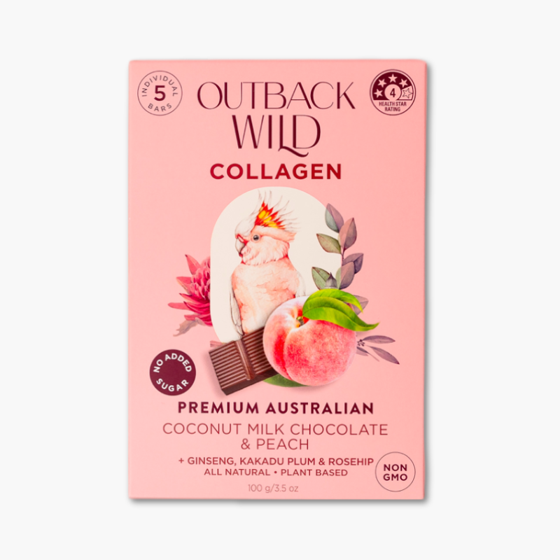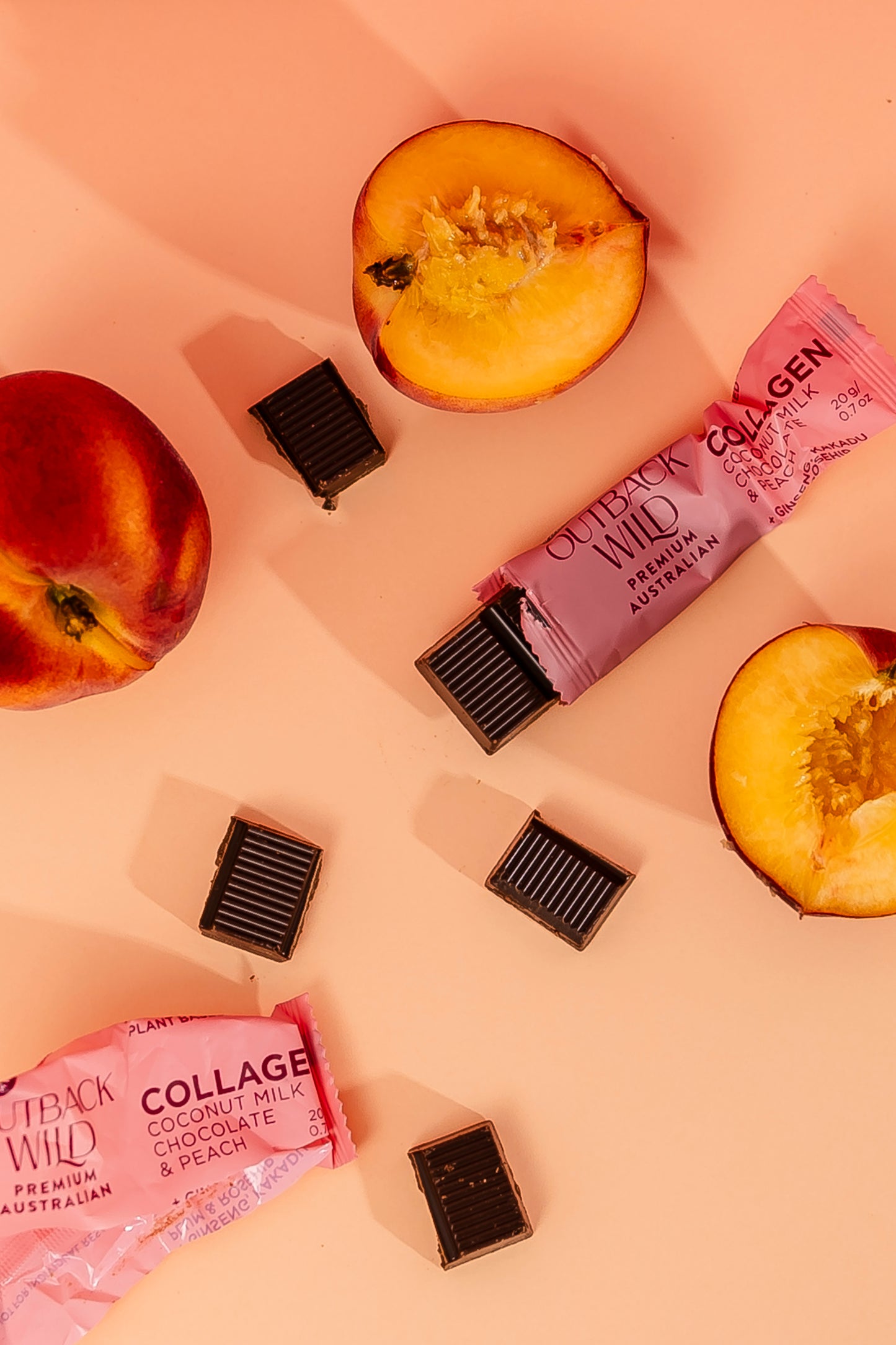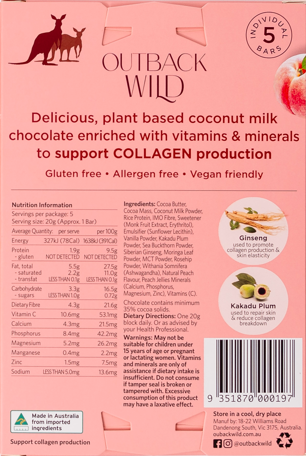IMO Fibre, Cocoa Butter, Coconut Milk Powder, Cocoa Mass, Sunflower Lecithin, Monk Fruit Extracts, Rice Protein, Erythritol, Kakadu Plum Powder, Sea Buckthorn Powder, Siberian Ginseng, Moringa Leaf Powder, MCT Powder, Rosehip Powder, Withania Somnifera (Ashwagandha) Natural Peach Flavour, Peach Jellies, Minerals (Calcium, Magnesium, Zinc, Phosphorus) Vitamins(C)